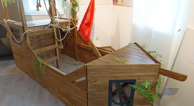 Piratenboot Holzboot, Spielboot, lasiert. Wurde zweimal in einer Ausstellung genutzt, sehr guter Zustand Lesen Sie den Artikel: Piratenboot mehr