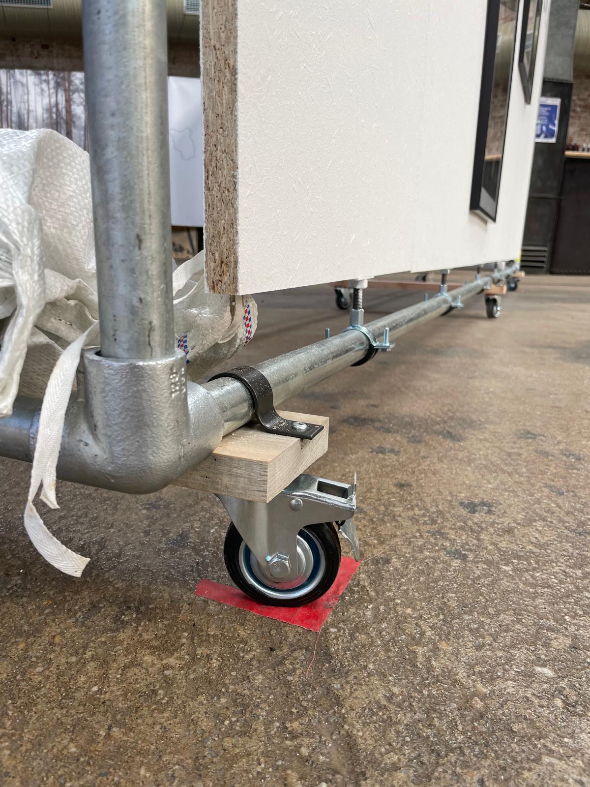Unter den 4 m Stellwänden sind 6 Räder, unter den 2 m Wänden 4 Schwerlasträder. Je Stellwand sind 2 extra Räder im Preis inklusive.